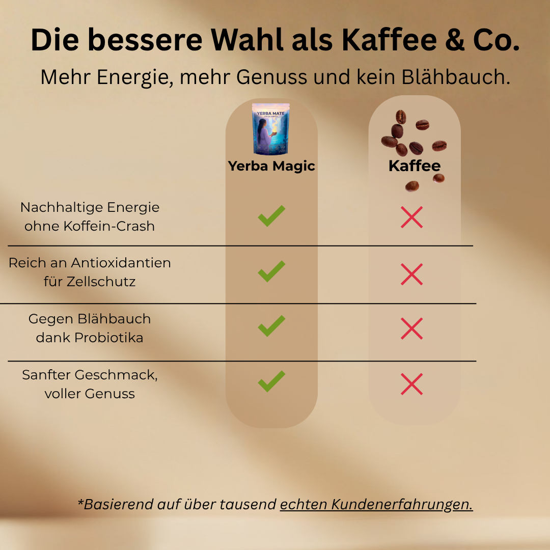 Ja! Yerba Magic kombiniert natürliches Koffein aus Yerba Mate mit Theanin und Antioxidantien. Das sorgt für wache Konzentration und ruhige Energie – ohne Herzrasen oder Coffee-Crash.